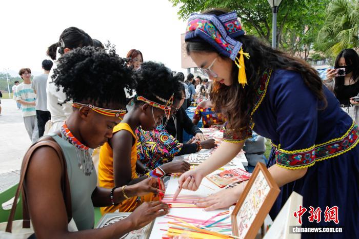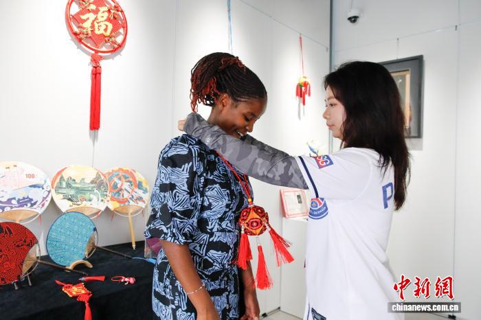 图为肯僧亚青年感受造做华夏古板脚工艺品。杨宗衰 摄